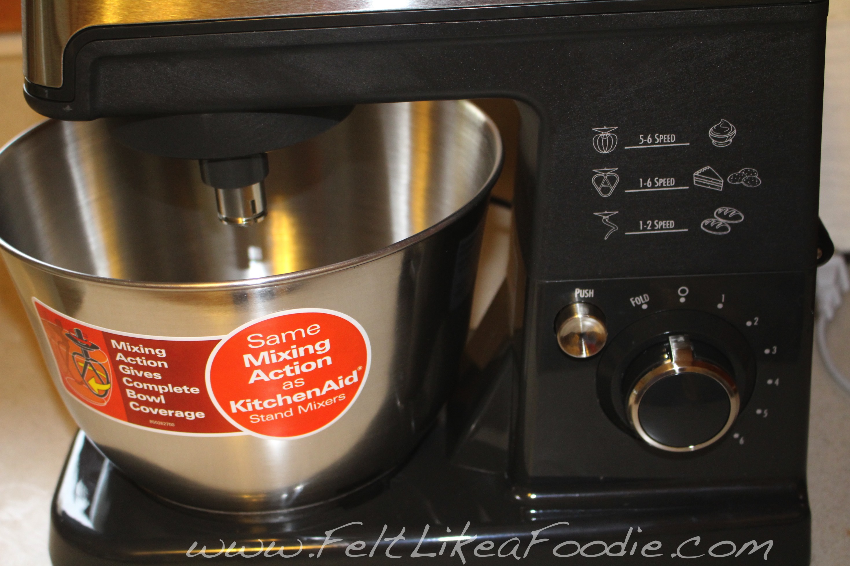 The spinning of the flat beater really rotated around and scraped the bowl as it twirled. (I still had to scrape a little bit.) This stand mixer is 6 speeds and came with the standard wire beater, dough hook and flat beater. (I liked that the front of the mixer had pictures so you always know the best choice in attachment for your particular recipe.)