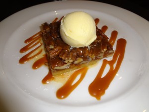 Finally, we dove into dessert. My Pecan Square was just sweet and warm enough to be a nice finishing touch to my meal. The warm caramel drizzle and the cool vanilla bean ice cream on top were also a nice touch. (Chocolate lovers have to go for the Chocolate dessert of velvet mousse cake coated in ground hazelnuts, Godiva chocolate sauce and fudgsicle sorbet.)